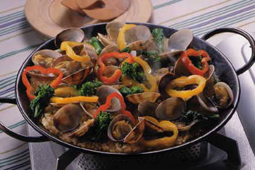 - 在锅内里往上橄榄油,,,,,,烧执热后先把蒜放入锅里炒,,,,,,再加入花甲和西兰花一起炒,,,,,,放上盐,,,,,,胡椒。。。。。。。。炒到花甲启齿,,,,,,倒入白葡萄酒1匙。。。。。。。。