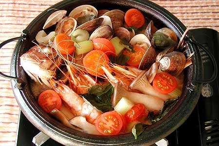 - 再往锅里放切好的凤尾鱼片,,,,,煎至香味出来后,,,,,再放入蛤蜊,,,,,番茄,,,,,西芹,,,,,水和白酒,,,,,盖上锅盖,,,,,煮沸后撇除浮沫,,,,,加以盐和胡椒粉调味。。。。。。